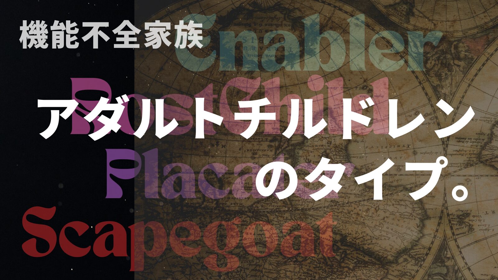 機能不全家族とは、家族が本来の役割(安心感の提供、成員の成長支援、情緒的サポートなど)を果たせず、成員に心理的負担やトラウマを与える家族システムを指します。 「見た目は普通の家庭でも、内部に問題を抱えている」場合が多く、子どもは適応するために不健全な役割を引き受けたりします。そのような子供をアダルトチルドレンと呼んでいます。
